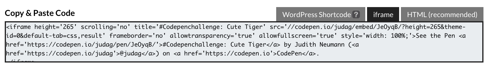 This is the quickest way to embed a CodePen preview on a Ghost site without any additional styling. Feel free to use the HTML embed code too, but note that you will probably need to layer on some custom styling depending on your theme.