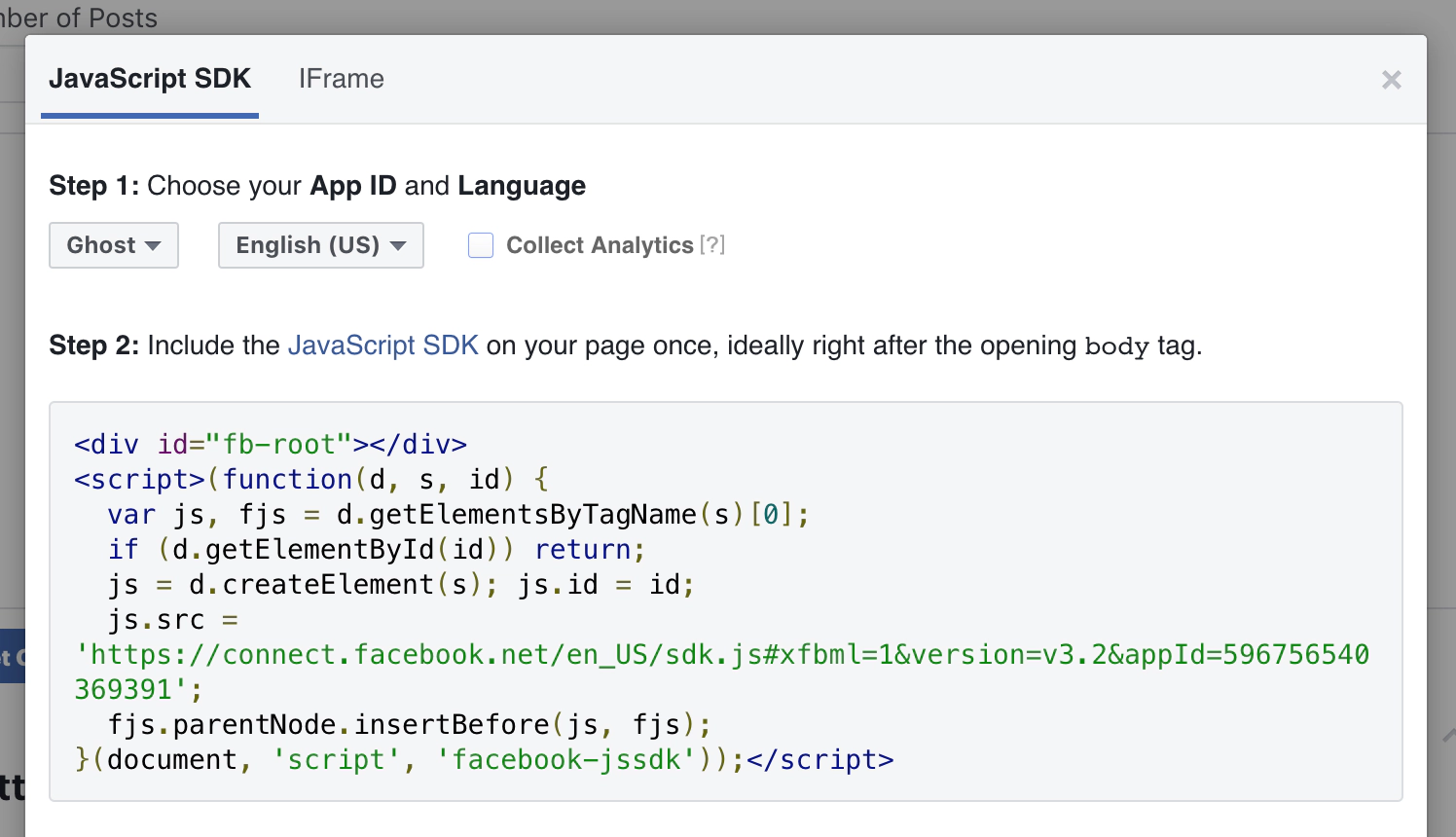 Click on the Get Code button on the Facebook Comments plugin settings page, and select the Facebook Page you would like to associate with your site comments. We recommend disabling the Collect Analytics feature.