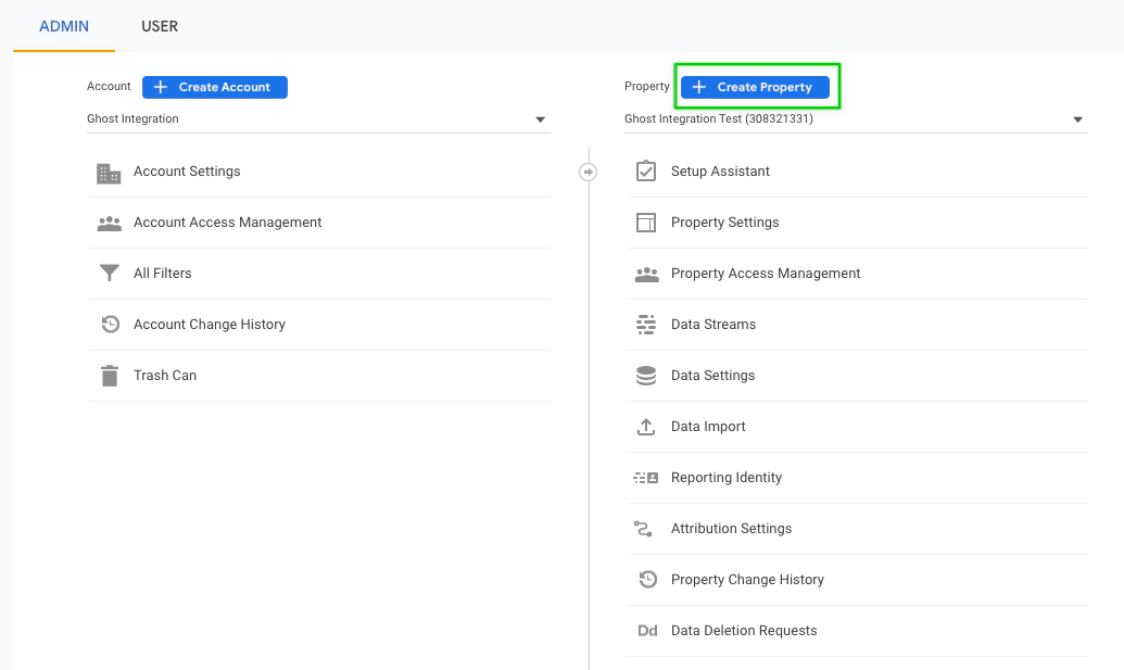 When you set up a new Google Analytics account, follow the prompts to create a new property for your Ghost site.