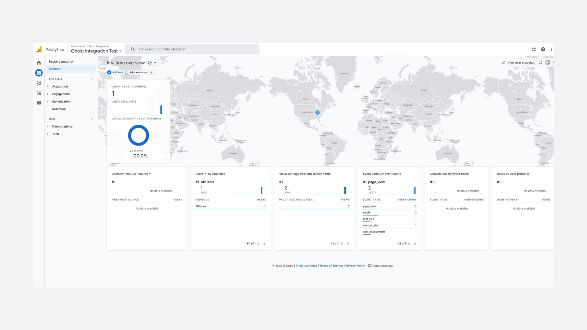 Your site is now fully integrated with Google Analytics. In Google Analytics, go to Reports in sidebar, click on Realtime, and refresh your site. Your activity on the dashboard confirms that Google Analytics is working on our site!