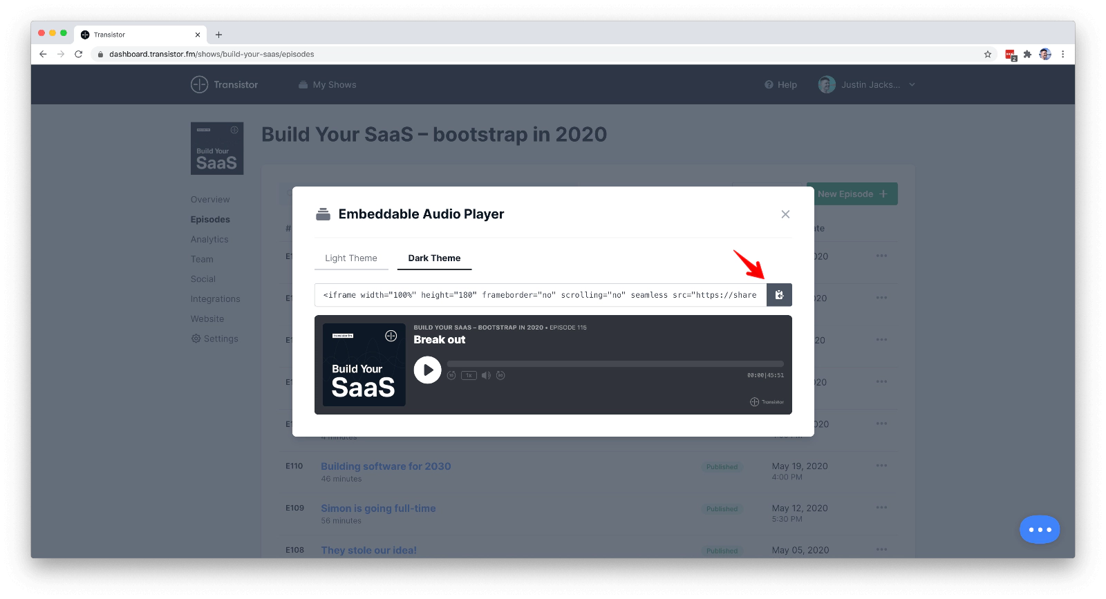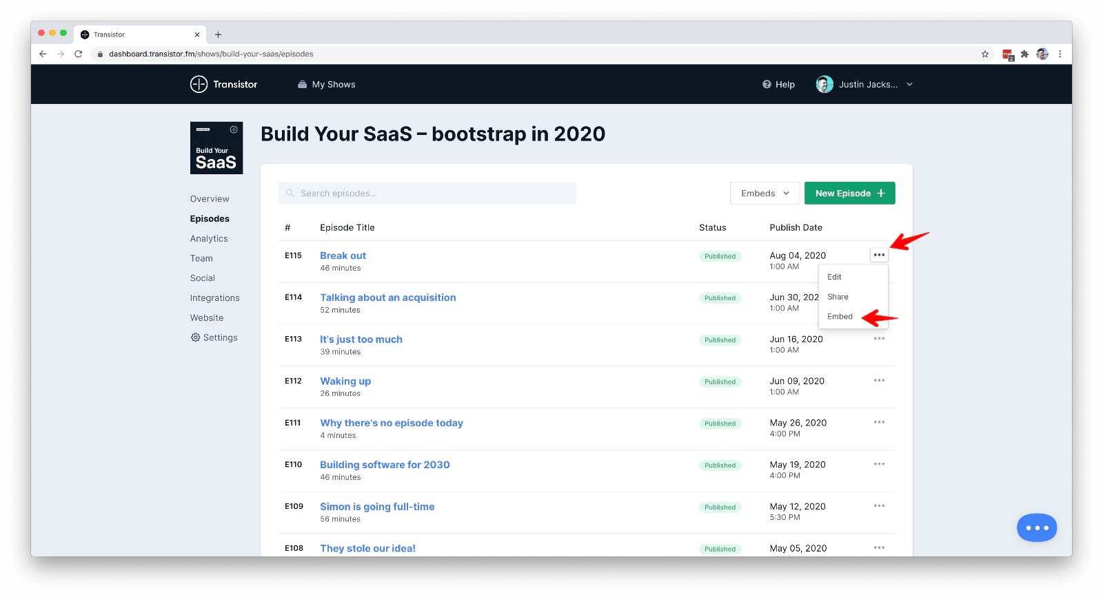 Go to the Episodes page in your Transistor dashboard, and click the ... icon on the right of the episode you’d like to embed.